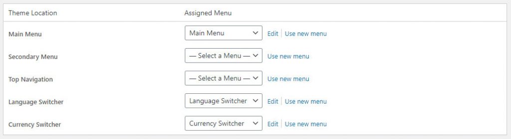 After you’ve finished creating a menu, you can select it’s menu location at the bottom of menu creation window or in Manage Locations tab.