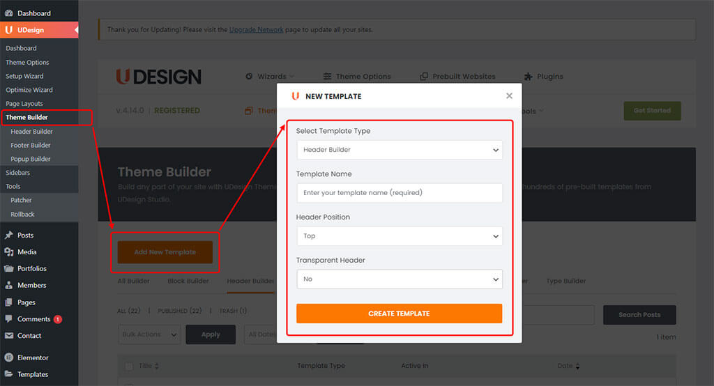 Step 3 – In New UDesign Builder Modal, select Header Builder in “Template Type” field. And give your block’s name in “Template Name” field.