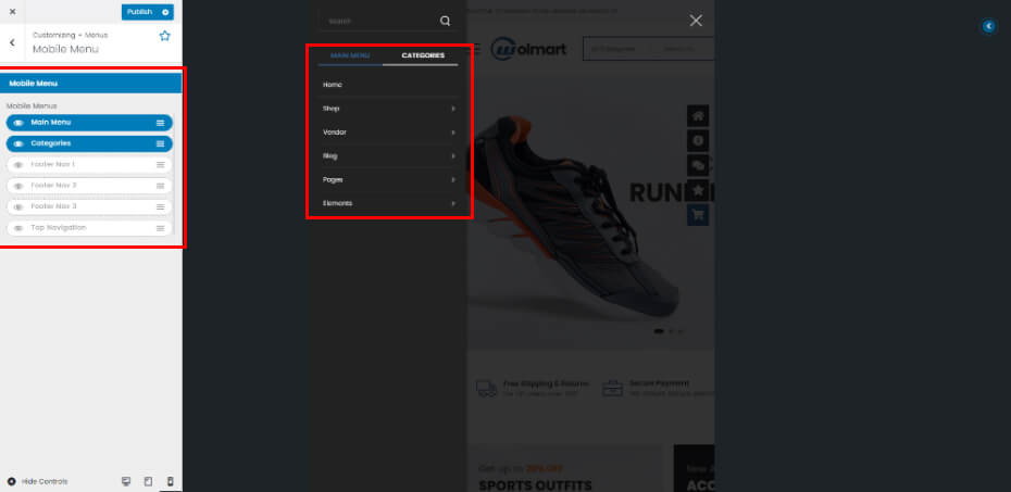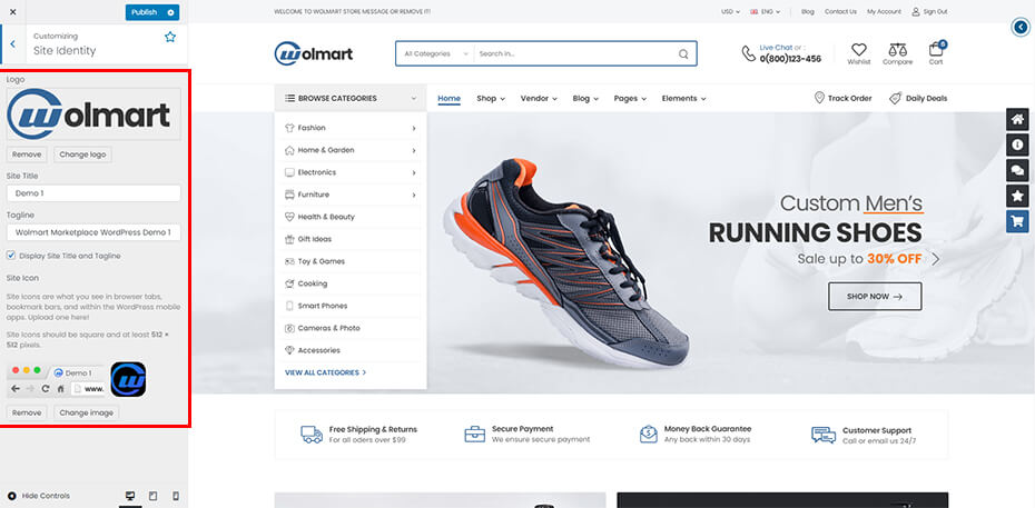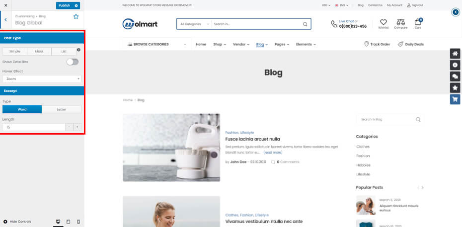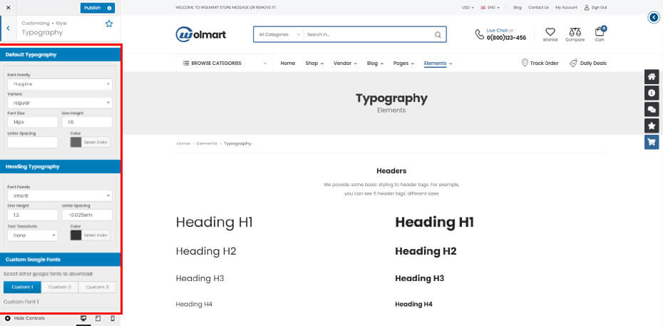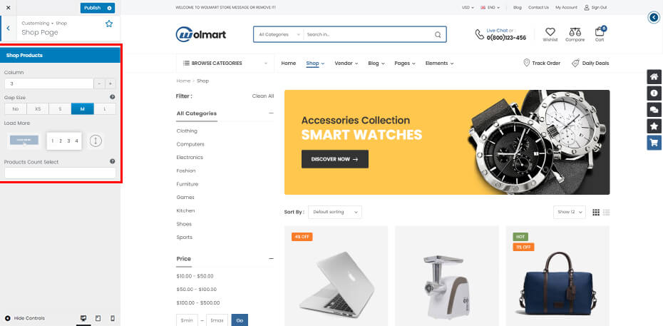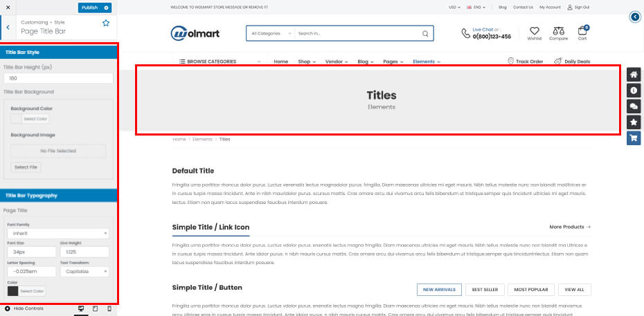 Wolmart Customizer Option is the heart of Wolmart options. They are presented in a well-organized panel, covering all areas of the theme. There are over 300 individual options here. These are global options that affect your entire site. You can set global site options easily with preview changes of site according to your setting
