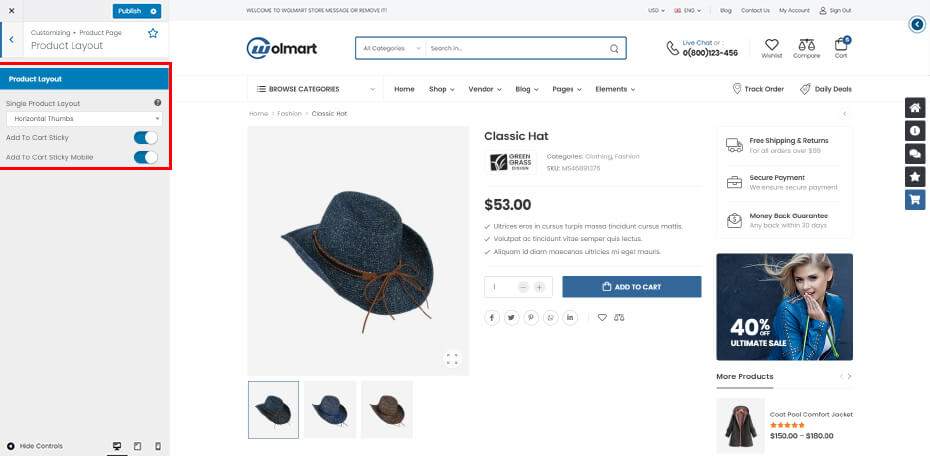 Product Layout: You can choose one of 7 product layout presets that Wolmart provides. And with ‘Add To Cart Sticky’ option, you can show add to cart bar at the bottom of product view page.