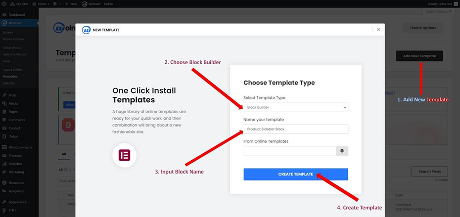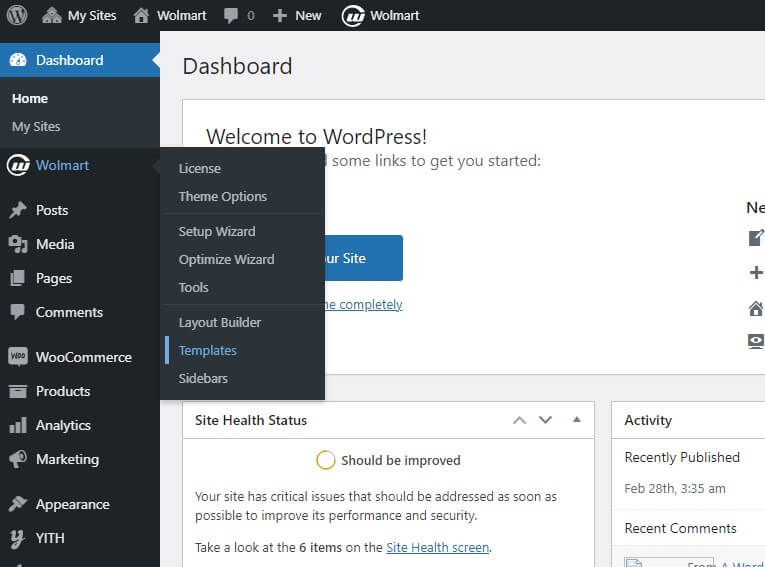 1. To create your own block, click Wolmart > Templates on admin panel.