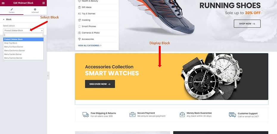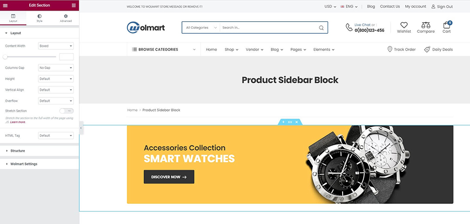 4. Drag & drop Wolmart Blocks element, then block you made are displayed on page.