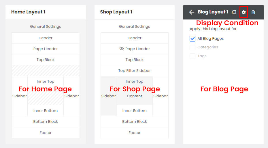 - Blog – Show layouts applied for only post archive pages such as blog page, post category pages, tag pages.